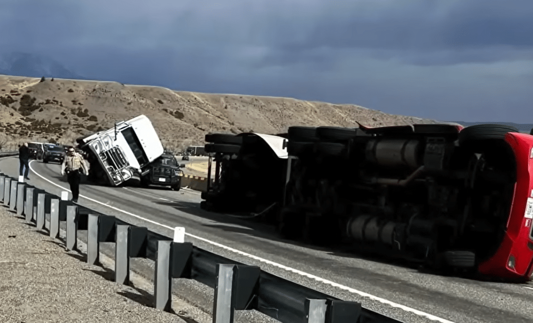 Two semitrailers toppled near Livingston, and one fell onto a deputy’s patrol vehicle as gusts …